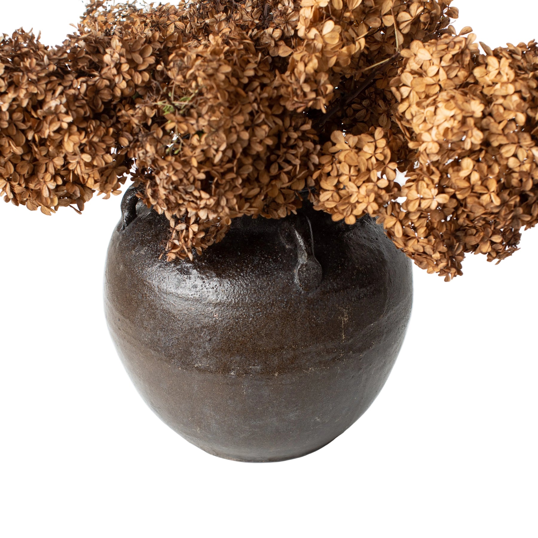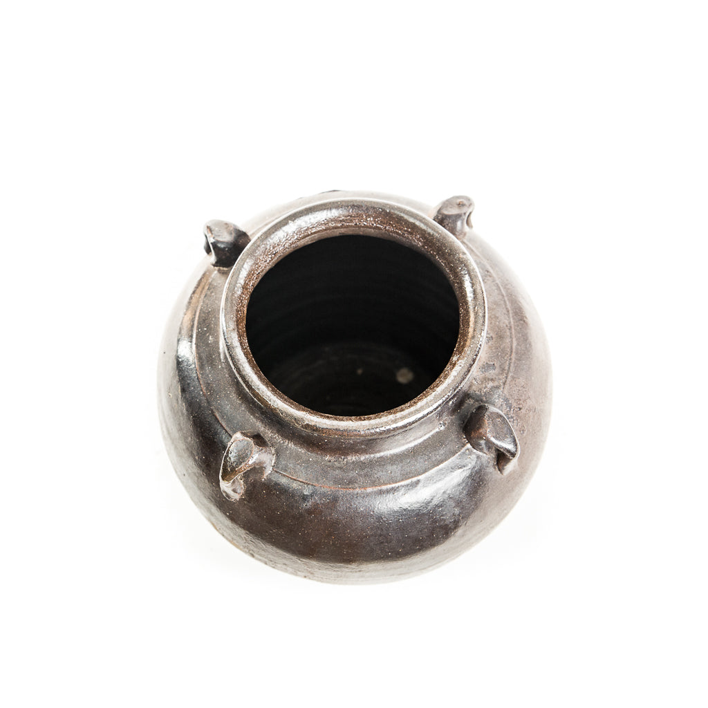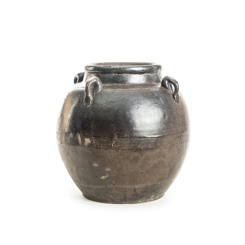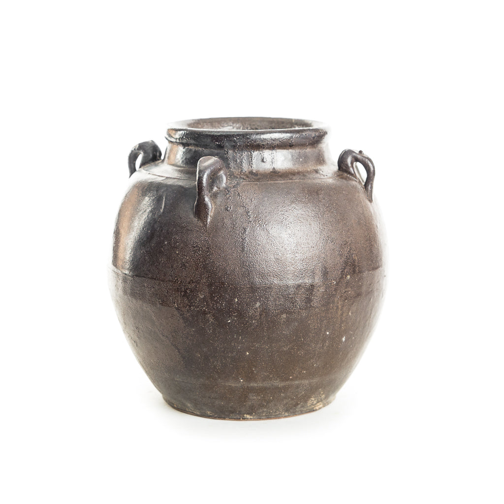 There are four small "handles" around the mouth of the pot that would have been used historically for placing carrying straps. Finished in a rustic, brown glaze with a hint of terra cotta exposed at the base, the Traditional Remy Pot is intended for decorative use. Each style varies.