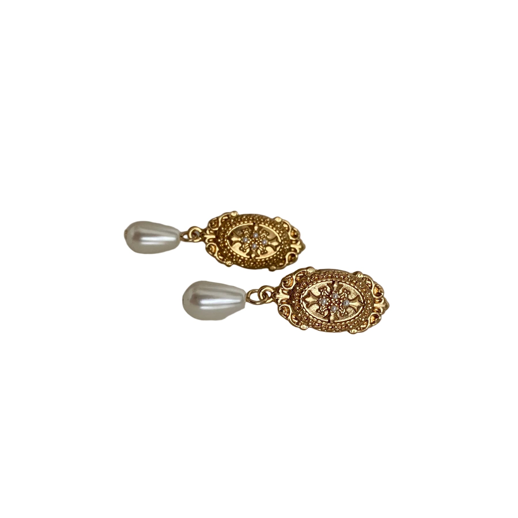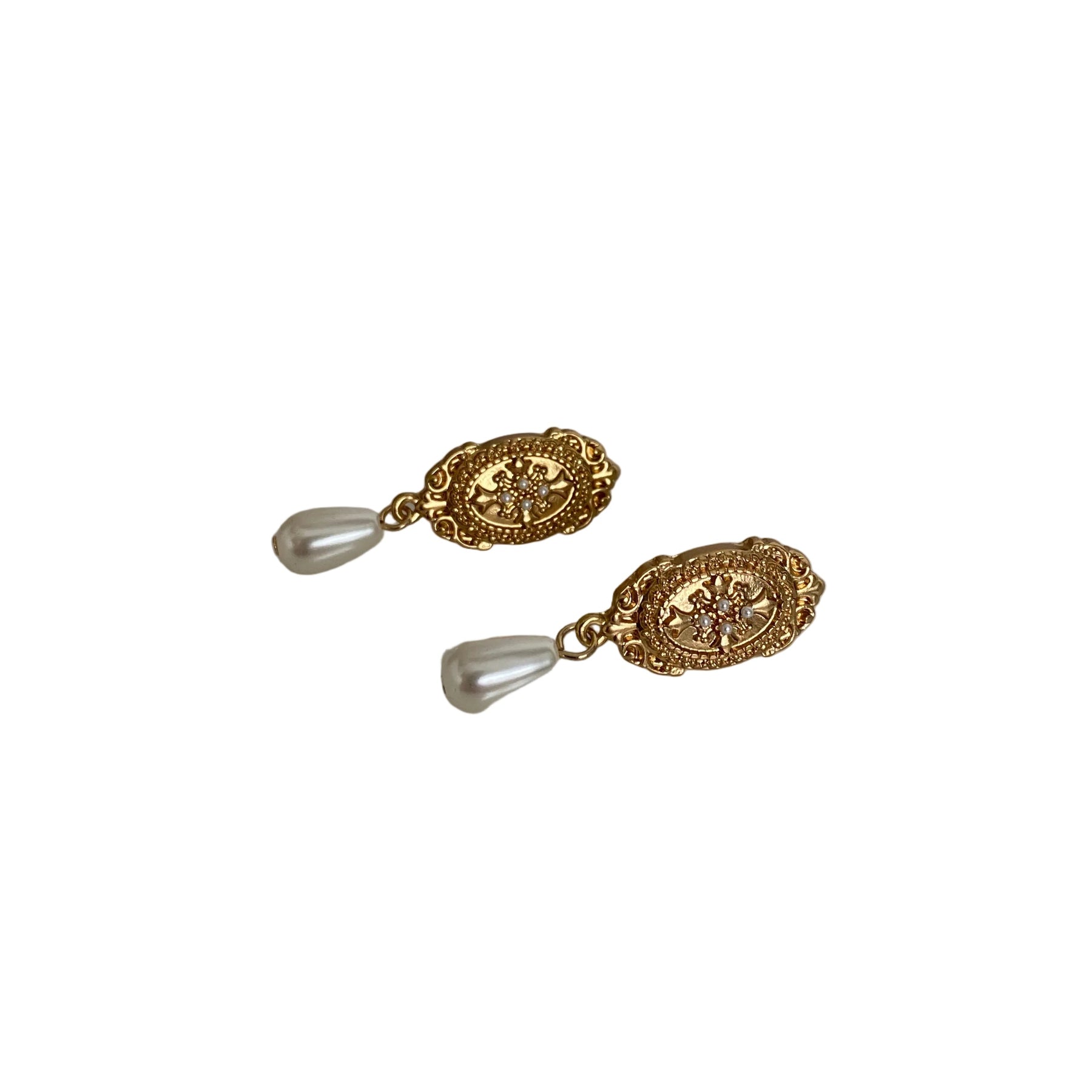 Regular price $18.50 Save $-18.50With a stunning cross embossing and dangling drop pearl, these Antique-Inspired Oval Earrings add a heirloom look to your outfit.Â