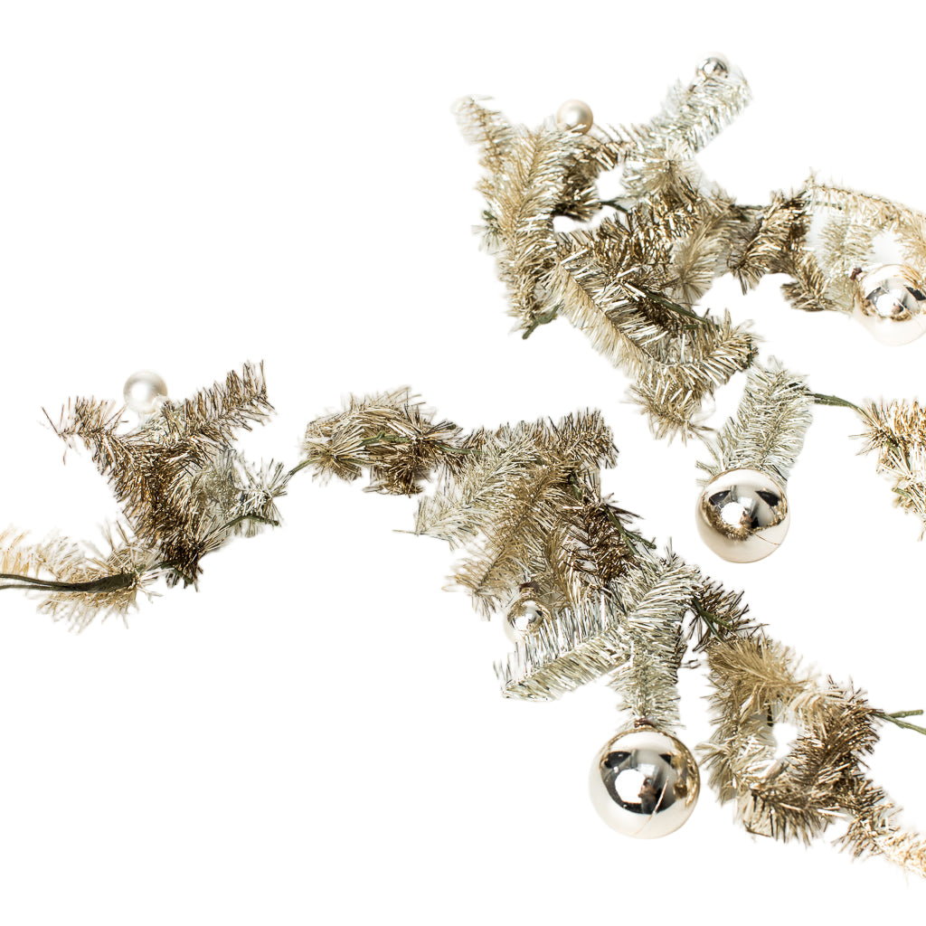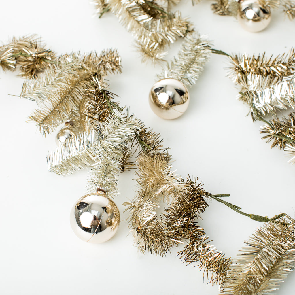 These plastic stemmed garlands with tinsel and plastic ornament bulbs are great for tucking into your existing arrangements.
